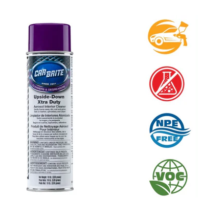 Upside-Down Xtra Duty is a dry foaming, interior cleaner with mint fragrance that cleans vinyl, leather, rubber, plastic and fabric surfaces without saturating the fabric.?ÿ Special spray head allows the can to be used upside down for hard-to-reach places.